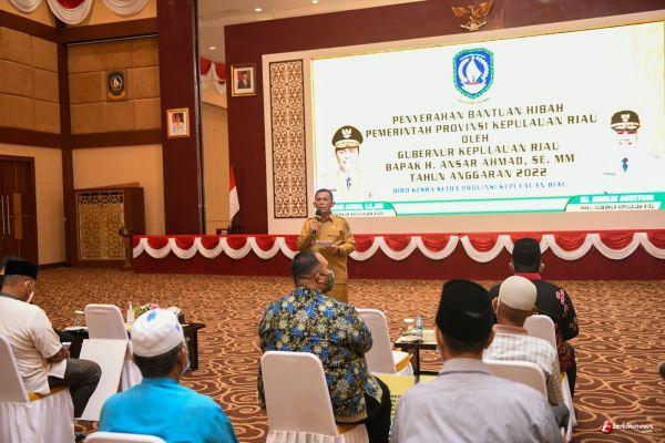 "Bantuan harus diserahkan sepenuhnya agar bermanfaat bagi penerimanya" tegas Gubernur Ansar pada Penyerahan Bantuan Dana Hibah Kepada Rumah Ibadah dan Organisasi Muslim Di Kota Tanjungpinang Tahun Anggaran 2022 Aula Wan Seri Beni Dompak, Senin (7/3).