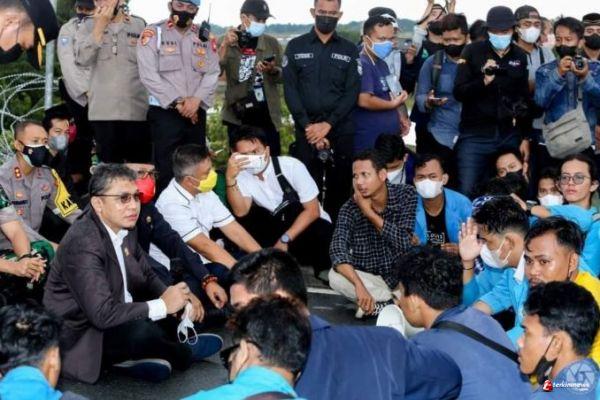 TANJUNGPINANG - Wakil Ketua II DPRD Kepri Raden Hari Tjahyono menyambut aksi demonstrasi mahasiswa yang terdiri dari berbagai kampus di Tanjungpinang, Kepulauan Riau, Senin (11/04/2022) di depan halaman kantor DPRD Kepri.