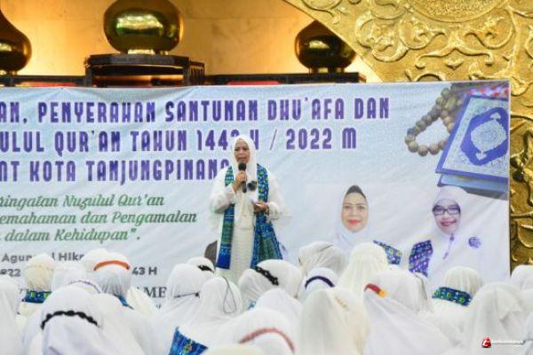 TANJUNGPINANG - Ketua Badan Kontak Majelis Taklim (BKMT) Provinsi Kepri Hj. Dewi Kumalasari Ansar memberikan santunan untuk kaum dhuafa masyarakat Kota Tanjungpinang di masjid Agung Al Hikmah, Tanjungpinang, Selasa (19/4). Penyerahan santunan untuk kaum dhuafa ini disejalankan dengan kegiatan peringatan Nuzulul Quran yang digelar BKMT Tanjungpinang.