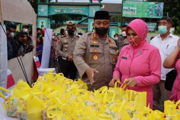 Kapolres Demak, AKBP Budi Adhy Buono bersama Ketua Bhayangkari Cabang Demak Ny. Echa Budi Adhy Buono membagikan takjil untuk masyarakat yang melintas di Alun-alun Simpang Enam Demak, Sabtu (23/4/2022) sore.