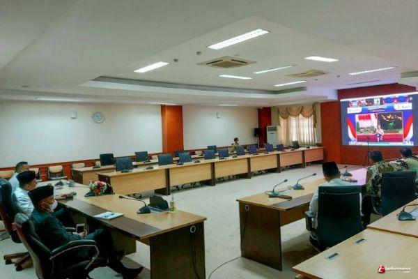 TANJUNGPINANG - Gubernur Kepri H. Ansar Ahmad didampingi Sekdaprov Adi Prihantara dan jajaran Kepala Organisasi Perangkat Daerah (OPD) di Provinsi Kepulauan Riau mengikuti pembukaan Musyawarah Rencana Pembangunan Nasional (Musrenbangnas) Tahun 2022 bersama Presiden RI Jokowi secara virtual di Istana Negara, dari Ruang Rapat Utama Lt.4, Kantor Gubernur Kepri, Dompak, Tanjungpinang, Rabu (28/04/2022).