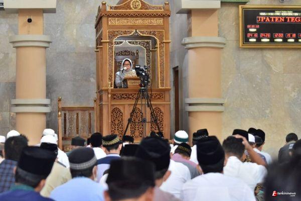TEGAL – Bupati Tegal Umi Azizah mengharapkan momen Ramadhan dan Idul Fitri tahun ini bisa memberikan semangat baru bagi masyarakat untuk bekerja lebih giat dan berkarya lebih hebat, disamping memperkuat persaudaraan antarsesama warga. Pesan ini disampaikan Umi sesaat sebelum pelaksanaan ibadah salat Idul Fitri 1 Syawal 1443 Hijriah di Masjid Agung Kabupaten Tegal, Senin (02/05/2022) pagi.