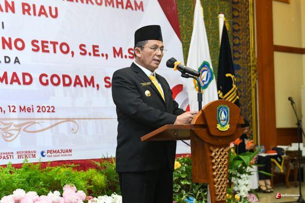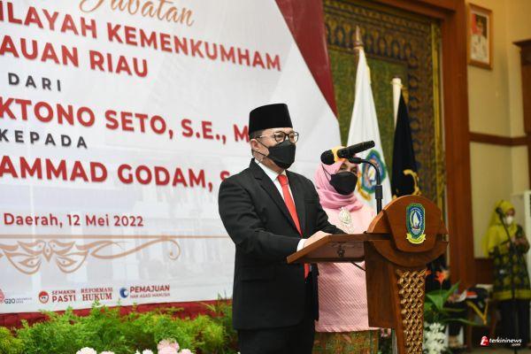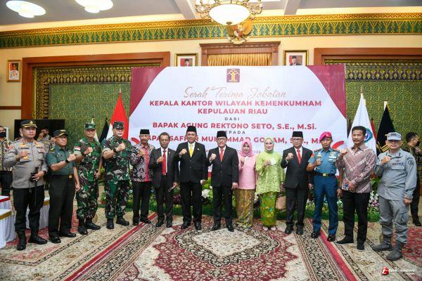 TANJUNGPINANG - Gubernur Kepulauan Riau H. Ansar Ahmad memimpin acara Serah Terima Jabatan (Sertijab) Kepala Kantor Wilayah Kementrian Hukum dan Hak Asasi Manusia (Kemenkumham) Provinsi Kepulauan Riau dari Rektono Seto, SE, M.Si kepada Saffar Muhammad Godam, SH. MH bertempat di Gedung Daerah Provinsi Kepri, Tanjungpinang, Kamis, (12/05).