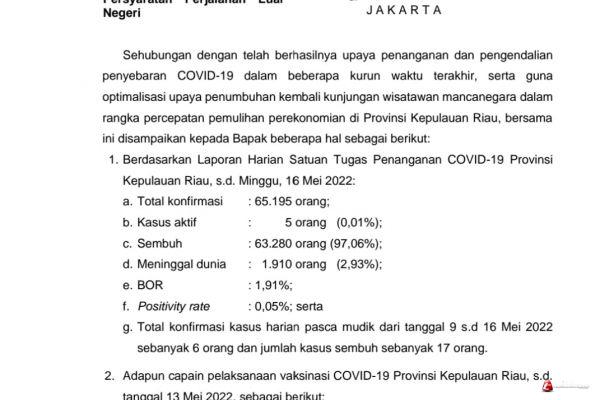Usulan Pemprov Kepri tersebut tertuang dalam surat yang ditandatangani Gubernur Ansar dan ditujukan kepada Kepala BNPB RI selaku Ketua Satgas Penanganan Covid19. Surat tertanggal 16 Mei 2022 dengan perihal Permohonan Relaksasi Persyaratan Perjalanan Luar Negeri tersebut berisi salah satunya permohonan peniadaan tes RT-PCR maupun Antigen dari negara asal dan pada saat kedatangan di pintu masuk Kepri.
