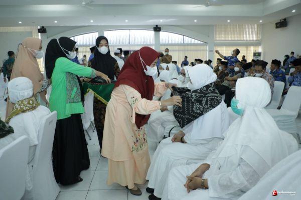 ASAHAN - Bupati Asahan H. Surya, BSc bersama dengan Ketua DPK Korpri Kabupaten Asahan, Para Asisten, Ketua TP PKK Kabupaten Asahan dan Ketua Dharma Wanita Persatuan Kabupaten Asahan melakukan upah-upah kepada 43 orang Anggota Korpri Kabupaten Asahan yang akan berangkat Haji pada tahun ini di Aula Melati Kantor Bupati Asahan, Kamis (09/06/2022).
