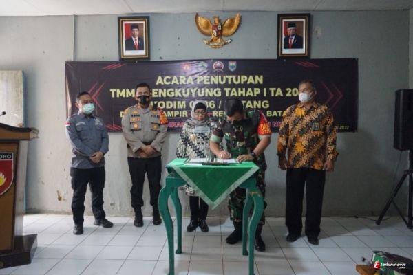 Penutupan kegiatan TMMD Sengkuyung tahap I tahun 2022 di wilayah Kodim 0736/Batang secara resmi ditutup, ditandai dengan penandatanganan serta penyerahan notulen hasil pelaksanaan TMMD dari Dandim 0736/Batang kepada PJ Bupati Batang.