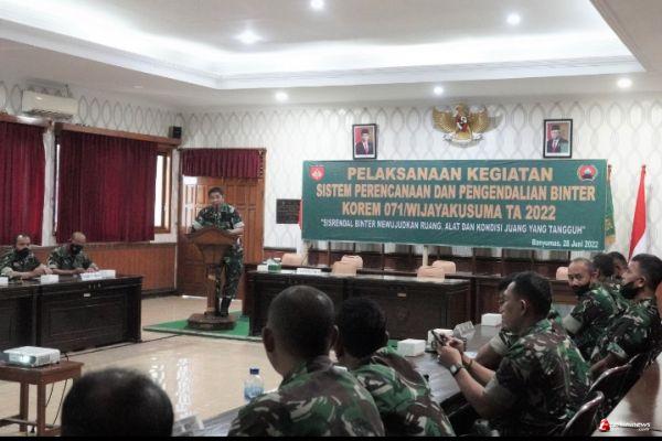 Komandan Korem 071/Wijayakusuma Kolonel Inf Yudha Airlangga, S.E., dalam sambutannya yang dibacakan Kasiterrem 071/Wijayakusuma Mayor Inf Darul Quthni, S.Ag., mengatakan sistem perencanaan dan pengendalian Binter, merupakan suatu proses kegiatan perencanaan yang dibuat secara teratur, terkoordinasi dan terpadu antara aparat kowil dan pemerintah daerah serta instansi terkait, untuk kepentingan kesejahteraan maupun kepentingan pertahanan negara dalam rangka mewujudkan pertahanan pada aspek darat.