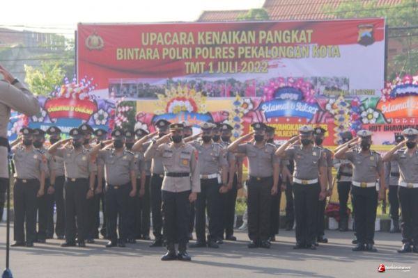 Kepolisian Resor Pekalongan Kota, Polda Jateng menggelar Upacara Kenaikan Pangkat Bintara, Terhitung mulai Tanggal (TMT) 1 Juli 2022 bertempat di Lapangan Apel Mapolres Pekalongan Kota, Jumat (1/7/2022).