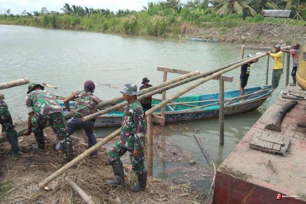 CILACAP - Menindaklanjuti perintah Komandan Kodim 0703/Cilacap, Danramil 09 Kawunganten Kapten Chb Sutarman, S.H., beserta anggota melaksanakan kegiatan kerja bakti pembuatan jembatan darurat yang menghubungkan 6 Dusun di Desa Ujunggagak Kecamatan Kampung Laut, Kabupaten Cilacap, Sabtu (2/7/22).