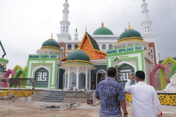 TANJUNGPINANG - Menjelang perhelatan MTQ ke-IX tingkat Provinsi Kepri di Kabupaten Kepulauan Anambas, Gubernur H. Ansar Ahmad memanfaatkan kunjungan kerjanya untuk meninjau langsung persiapan pembukaan MTQ di Masjid Agung Baitul Ma'mur, Tarempa, Sabtu (9/7). Didampingi Bupati Anambas Abdul Haris, Gubernur Ansar berkeliling melihat Astaka Utama MTQ ke-IX Provinsi Kepri.