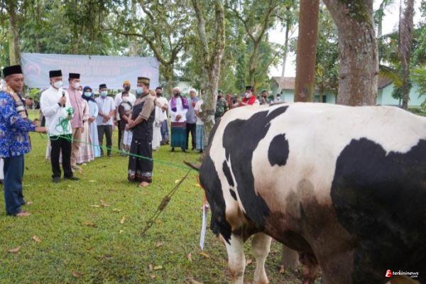 Danrem 071/Wijayakusuma Kolonel Inf Yudha Airlangga, S.E., pada momen Idul Adha 1443 H/2022 M menyerahkan hewan qurban kepada panitia qurban dari Bintalrem 071/Wijayakusuma. Minggu (10/7/2022) di Lapangan Denzibang I/IV komplek Makorem 071/Wijayakusuma, Sokaraja, Banyumas.