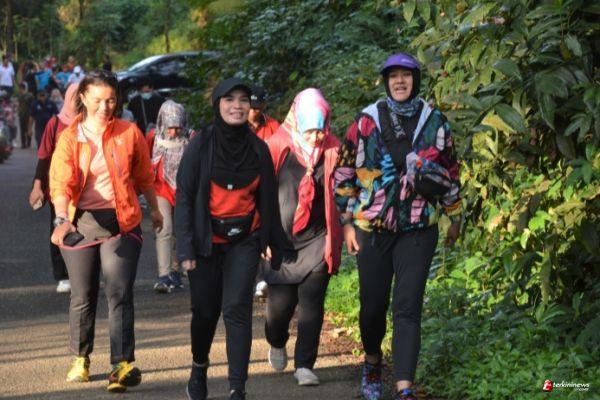 Ketua Persit Kartika Chandra Kirana Koorcab Rem 071 PD IV/Diponegoro Ny. Natania Yudha Airlangga dengan didampingi Wakil Ketua Persit Kartika Chandra Kirana Koorcab Rem 071 PD IV/Diponegoro Ny. Wiwin Candra dan Ketua Persit Kartika Chandra Kirana Cabang XVI Kodim 0701/Banyumas Ny. Niar Iwan Dwi Prihartono serta Ketua Persit Kartika Chandra Kirana Cabang XVIII Kodim 0703/Cilacap Ny. Ninda Andi Afandi,ikuti jalan sehat Forkopimda Banyumas dan Cilacap Eksplor Wisata Baturaden. Jumat (5/8/2022) di Lokawisata Baturaden, Banyumas.