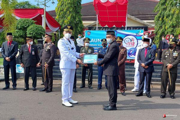 Peluncuran layanan NTPD 112 yang secara simbolis oleh Wakil Bupati Tegal Sabilillah Ardie berlangsung pada upacara peringatan HUT ke 77 Kemerderkaan Republik Indonesia di Lapangan Pemkab Tegal, Rabu (17/08/2022).