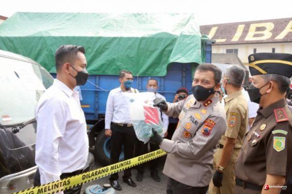 Dalam jumpa pers tersebut, para tersangka dari 35 Kabupaten Kota dihadirkan. Selain itu ada pula sample barang bukti truk tangki, mobil yang dimodif memiliki tandon, dan juga alat alat lainnya untuk menimbun minyak.