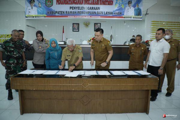 ASAHAN - Bupati Asahan H. Surya, BSc bersama dengan Forkopimda Kabupaten Asahan, OPD dan Camat se-Kabupaten Asahan menandatangani deklarasi komitmen penyelenggaraan Kabupaten Ramah Perempuan dan Layak Anak di Aula Melati Kantor Bupati Asahan, Selasa (20/09/2022)
