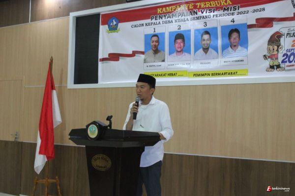 Kuala Sempang, Bintan - Penyampaian visi dan misi oleh calon Kepala Desa Kuala Sempang Nomor urut 2, Kohen Sofi, S.Sos,. M.IP yang mengikuti kontestasi Pemilihan Kepala Desa (Pilkades) serentak di Kabupaten Bintan, kepulauan Riau, akan digelar pada 29 September 2023 mendatang.