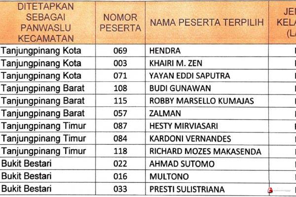 Ketua Bawaslu Kota Tanjungpinang Muhamad Zaini, M.Kom.I menjelaskan bahwa Bawaslu Kota Tanjungpinang telah resmi menetapkan dan mengumumkan 12 orang yang terpilih sebagai Anggota Panwaslu Kecamatan Se-Kota Tanjungpinang, melalui Surat Pengumuman Nomor : 060/KP.01.00/K.KR-06/10/2022, hari Rabu 26 Oktober 2022. Informasi nama-nama yang lulus dapat mengunjungi dan mengunduhkan langsung melalui Website atau Media Sosial Bawaslu Kota Tanjungpinang, maupun melihat di papan pengumuman Kantor Bawaslu Kota Tanjungpinang.