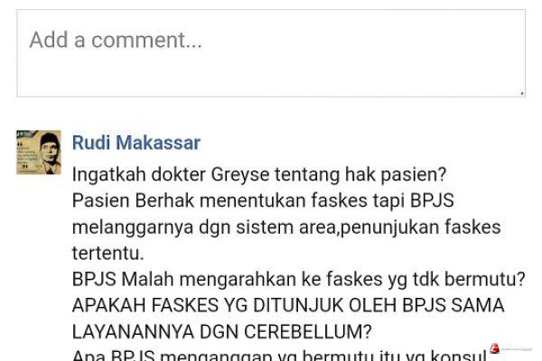 SUNGGUH TERLALU BPJS KALAU BEGINI. Mohon kerjasamanya dilanjutkan dengan Cerebellum. Kami sudah dapatkan layanan yg baik dari Cerebellum. Salam akal sehat". Sebut Rudi Makassar dalam komentarnya.