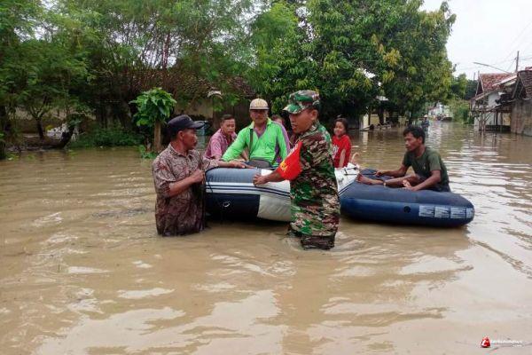 Tampak Babinsa setempat Serda Bambang, bersama perangkat desa melakukan patroli di wilayah banjir dengan LCR milik desa setempat.