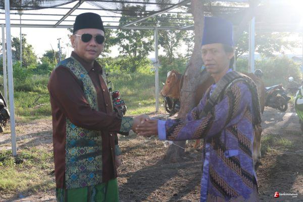TEGAL - Wali Kota Tegal, H. Dedy Yon Supriyono menyerahkan langsung hewan kurban dari Pemerintah Kota Tegal berupa seekor sapi di Masjid Ats Tsumery Kota Tegal, Kamis (29/6) pagi usai solat Idul Adha didampingi Kepala OPD di Lingkungan Pemerintah Lota Tegal, Camat dan Lurah se-Kota Tegal.