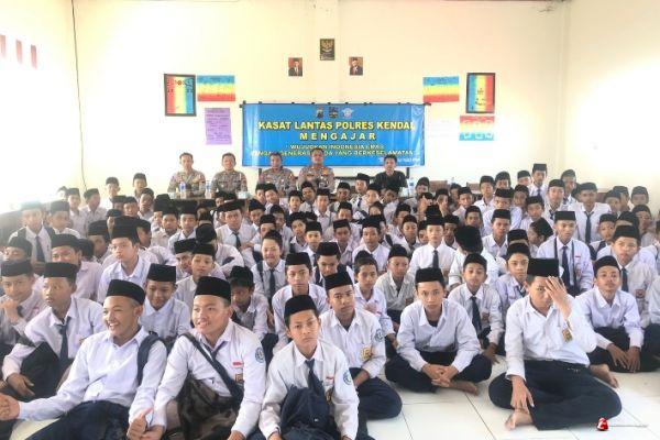 Ka Sat Lantas Polres Kendal AKP Rizky Widyo Pratomo SIK MH bersama anggota Sat lantas Polres Kendal mengedukasi pelajar SMP Manbaul Hikmah dengan menanamkan budaya tertib berlalu lintas serta sosialisasi keselamatan berlalu lintas.