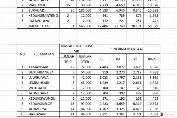 Ketua PMI Kab Tegal, H. Iman Sisworo, SH melalui Kepala Markas PMI Kabupaten Tegal Sunarto saat ditemui diruang kerjanya,senen 11/9/2023 mengatakan di wilayah Kabupaten Tegal, ada 18 desa yang tersebar di 6 Kecamatan yang rawan krisis air bersih.Yakni Kecamatan Jatinegara