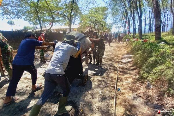 Dalam TMMD reguler ke-118 ini masih difokuskan pengerjaan cor jalan. Satgas TMMD bersama warga saling bergotong royong dan bergantian, ada yang menyiapkan material campuran untuk bahan cor, semua itu mereka lakukan dengan alat sederhana ember, cangkul untuk digunakan memasukkan material ke dalam mesin molen biar tercampur rata dan hasil yang maksimal, rasa lelah dan bercucuran keringat makin bertambah pula semangat kerjanya, pungkasnya.