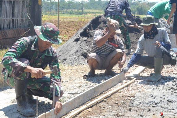 Dalam kesempatan tersebut tanpa rasa canggung ataupun gengsi sebagai perwira, Lettu Inf Endri Marjiyono turut membantu dalam penyiapan begisting cor jalan bersama salah satu warga desa Purwogondo.