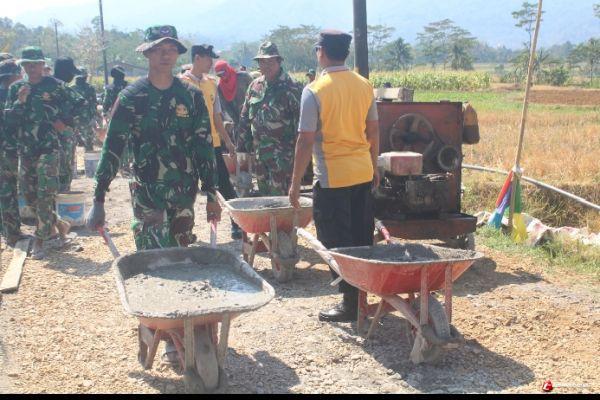 KENDAL - Satgas TNI Manunggal Membangun Desa (TMMD) Reguler Ke-118 Kodim 0715/Kendal bersama dengan warga masyarakat kompak mendorong angkong di lokasi rabat beton jalan yang berada di tengah Desa Purwogondo ,Kecamatan Boja, Kabupaten Kendal.