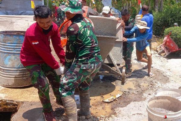 Terlihat dilokasi anggota TNI dibantu warga desa sedang menarik dan mendorong mesin molen untuk kemudian ditempatkan mendekati lokasi pengerjaan betonisasi jalan, ini dimaksudkan agar mendapatkan posisi yang tepat, dekat materal dan lokasi pekerjaan.