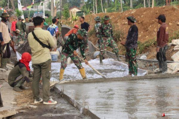 Satgas TMMD bersama masyarakat setempat sangat antusias untuk saling bahu-membahu dengan penuh semangat menyelsaikan pengecoran jalan. Pelibatan warga sejak awal ini guna mempercepat dalam penyelesaian pengecoran.