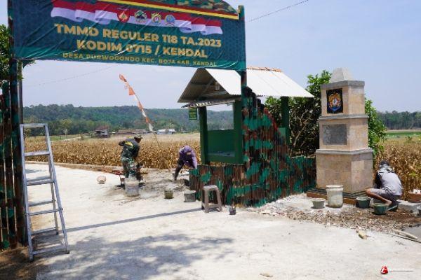 Kendal - Menjelang upacara penutupan TNI Manunggal Membangun Desa (TMMD) Reguler ke - 118 Kodim 0715/Kendal, proses pembuatan tugu prasasti sebagai saksi sejarah pelaksanaan TMMD di Desa Purwogondo Kecamatan Boja itu sudah bediri kokoh. Beberapa Tentara Satgas mulai mengecat tugu dengan warna hijau khas uniform TNI.