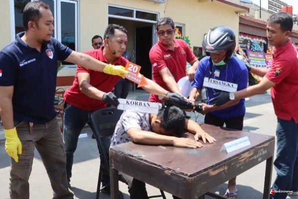 TEGAL - Satuan Reserse Kriminal (Satreskrim) Polres Tegal Kota menggelar rekonstruksi kasus pembunuhan di Pasar Randugunting Kota Tegal beberapa waktu lalu. Kegiatan rekontruksi tergelar di halaman Mapolres, Kamis (21/12/2023) siang.