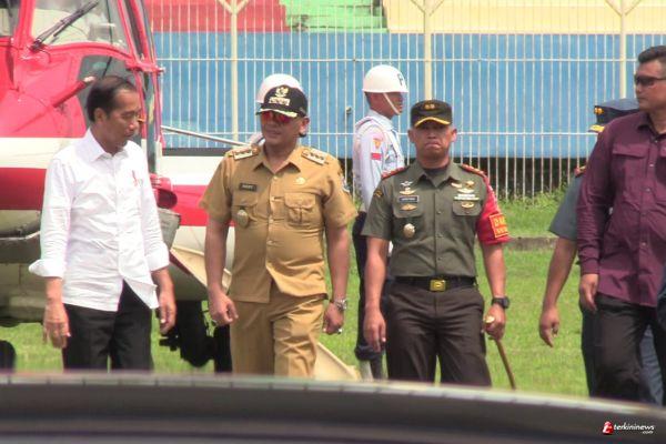 TEGAL - Sesaat setelah mendarat dengan helikopter di Stadion Yos Sudarso Kota Tegal, Presiden Republik Indonesia Joko Widodo disambut Wali Kota Tegal, Dedy Yon Supriyono beserta Forum Komunikasi Pimpinan Daerah (Forkopimda) Kota Tegal, Rabu (03/01/2024).