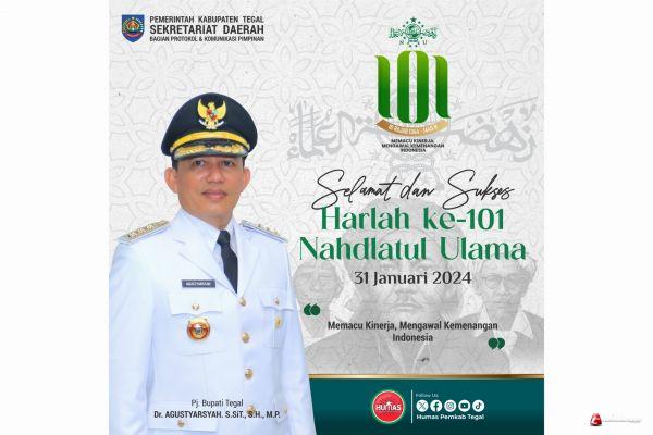 TEGAL - Pemerintah Kabupaten Tegal Mengucapkan Selamat dan sukses Harlah ke-101 Nahdlatul Ulama (NU) pada 31 Januari 2024. Bertema " Memacu Kinerja, Mengawal kemenangan Indonesia".