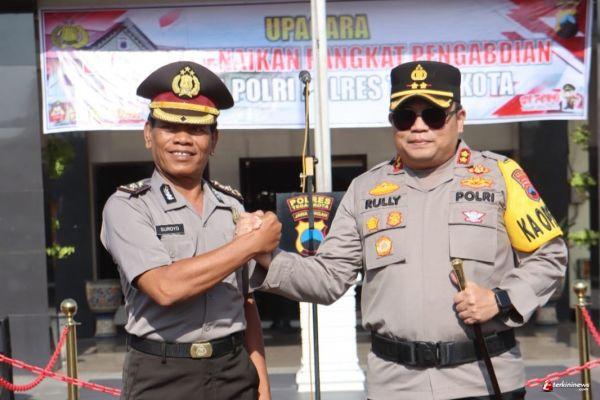 TEGAL - Menjelang purna tugas personel Polres Tegal Kota menerima kenaikan pangkat pengabdian setingkat lebih tinggi. Dari pangkat semula, Ajun Komisaris Polisi (AKP) menjadi Komisaris Polisi (Kompol).