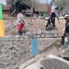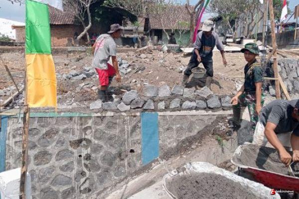 Yogyakarta - Dibawah panasnya terik matahari, Satgas TMMD Reguler Ke-121 Kodim 0734/Kota Yogyakarta bersama warga masyarakat menyelesaikan pengerjaan pembangunan Talud Pemakaman Kyai Wongso Sukarto yang sampai saat ini masih berlangsng, Sabtu (03/08/2024)