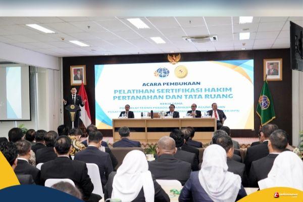 BOGOR - Kementerian Agraria dan Tata Ruang/Badan Pertanahan Nasional (ATR/BPN) berkolaborasi dengan Mahkamah Agung (MA) menyelenggarakan Pelatihan Sertifikasi Hakim Pertanahan dan Tata Ruang untuk pertama kalinya. Pembukaan pelatihan dihadiri oleh Menteri ATR/Kepala BPN, Agus Harimurti Yudhoyono (AHY) dan Ketua MA, Muhammad Syarifuddin di Aula Pusat Pengembangan Sumber Daya Manusia (PPSDM) Kementerian ATR/BPN, Cikeas, Kabupaten Bogor, Provinsi Jawa Barat, Rabu (02/10/2024).