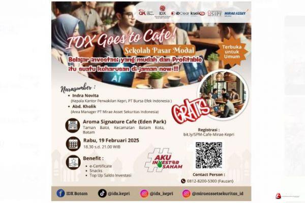 BATAM – IDX Kepri bersama PT Mirae Asset Sekuritas Indonesia sukses menggelar acara Sekolah Pasar Modal di Aroma Signature Cafe (19/02/2025), Eden Park. Mengusung tema “IDX Goes to Cafe: Belajar Investasi yang Mudah dan Profitable Itu Suatu Keharusan Jaman Now”, kegiatan ini bertujuan untuk memberikan edukasi investasi kepada masyarakat, khususnya generasi milenial dan Gen Z.