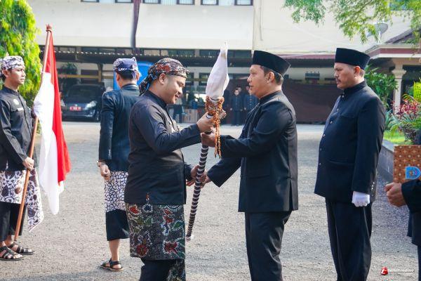 TEGAL - Bupati Tegal Ischak Maulana Rohman menyerahkan pataka atau panji-panji kedaerahan berupa Tombak Pusaka Kyai Plered, Bendera Pakta Integritas dan Bendera Merah Putih kepada keluarga besar Kalisoka, Jumat (16/05/2025).