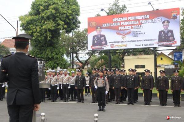 TEGAL - TERKININEWS.COM - Kapolres Tegal, AKBP Bayu Prasatyo, S.H., S.I.K., M.H., memimpin upacara peringatan Hari Lahir Pancasila yang digelar di halaman Mapolres Tegal. Acara ini dihadiri oleh Wakapolres Tegal, Kompol M. Iskandarsyah, S.P., S.I.K., M.M., para Pejabat Utama (PJU) Polres Tegal, serta seluruh anggota Polres Tegal. Senin, 2 Juni 2025