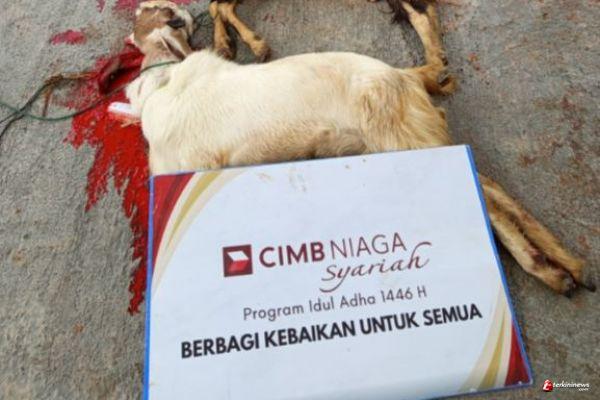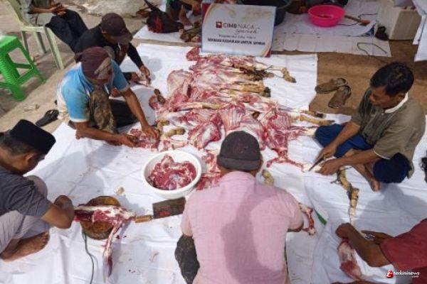 BATAM - TERKININEWS.COM — Suasana hari raya Idul Adha yang penuh dengan gema takbir dan tahmid dimanfaatkan DT Peduli Kepri untuk menyalurkan amanah dari Bank CIMB Niaga Syariah Batam. Pada momen tersebut, dilakukan penyembelihan hewan kurban sebanyak 5 ekor kambing.