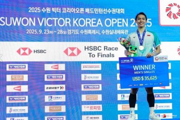 BULU TANGKIS - TERKININEWS.COM - Pebulu tangkis Indonesia, Jonatan Christie, sukses meraih gelar juara Korea Open 2025 setelah mengalahkan tunggal putra Denmark, Anders Antonsen, pada laga final yang berlangsung di Gimnasium Suwon, Minggu (28/9).