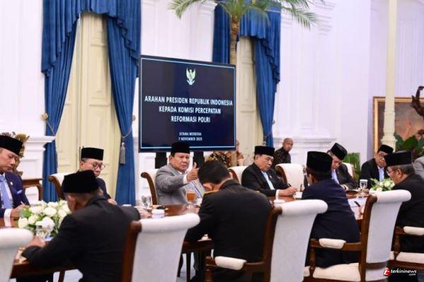 JAKARTA - TERKININEWS.COM - Presiden Prabowo Subianto resmi melantik keanggotaan Komisi Percepatan Reformasi Kepolisian Negara Republik Indonesia (Polri) di Istana Merdeka, Jakarta, Jumat (07/11/2025). Pelantikan berdasarkan Keppres Nomor 122/P Tahun 2025. Jimly Asshiddiqie ditetapkan sebagai ketua, dengan anggota antara lain Ahmad Dofiri, Mahfud MD, Yusril Ihza Mahendra, Supratman Andi Agtas, Otto Hasibuan, Listyo Sigit Prabowo, Tito Karnavian, Idham Azis, dan Badrodin Haiti.