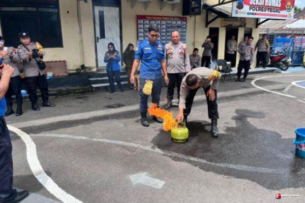 Instruktur dari Dinas Pemadam Kebakaran Kabupaten Tegal memberikan simulasi penanganan kebakaran menggunakan tabung gas LPG, yang diikuti dengan antusias oleh seluruh peserta, termasuk para pejabat Polres Tegal.
