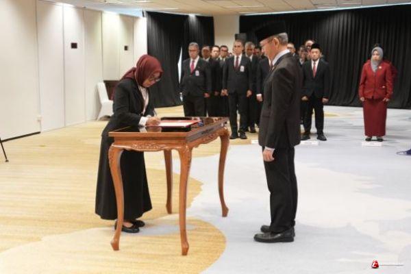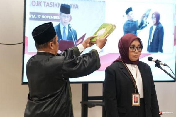 JAKARTA - TERKININEWS.COM - Ketua Dewan Komisioner Otoritas Jasa Keuangan (OJK) Mahendra Siregar melantik dan mengambil sumpah jabatan Nofa Hermawati sebagai Kepala OJK Tasikmalaya, dalam acara yang berlangsung di Kantor OJK, Gedung Wisma Mulia, Jakarta, Senin.