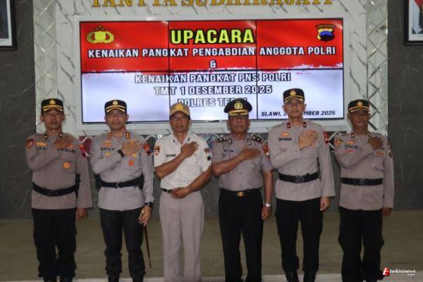 TEGAL - TERKININEWS.COM - Polres Tegal menggelar upacara laporan kenaikan pangkat pengabdian anggota Polri dan kenaikan pangkat PNS Polri periode TMT 1 Desember 2025, Selasa (02/12) pukul 09.00 WIB di Gedung Tantya Sudhirajati.